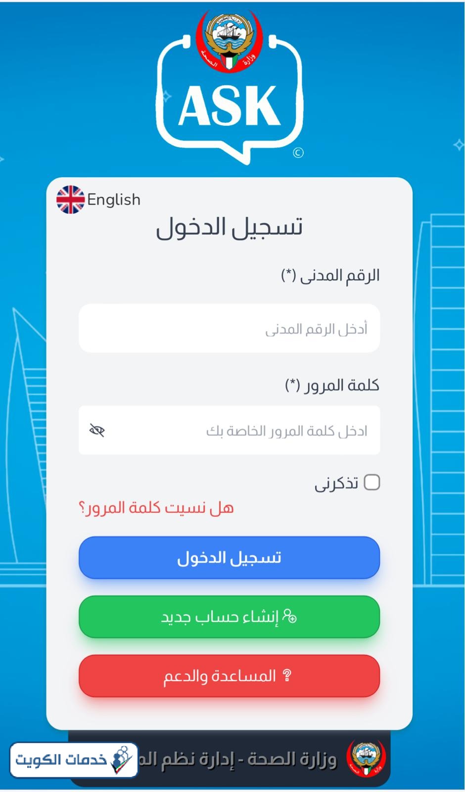 • تسجيل الدخول عن طريق إدخال الرقم المدني وكلمة المرور، أو الضغط على أيقونة “إنشاء حساب جديد” لمن لا يمتلك حساب.