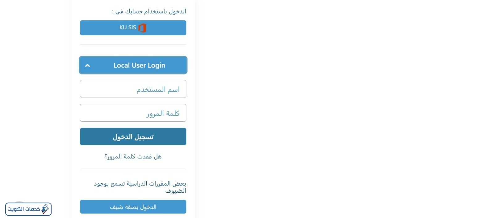 - اختيار طريقة تسجيل الدخول المناسبة (حساب KU SIS، أو حساب محلي).